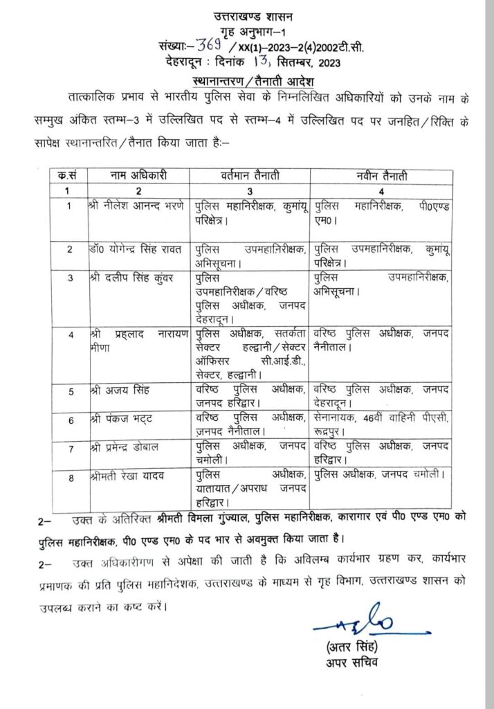 गृह विभाग उत्तराखंड शासन ने 13 सितम्बर देर शाम 8 आईपीएस अधिकारियों के दायित्वों में फेरबदल किया है।