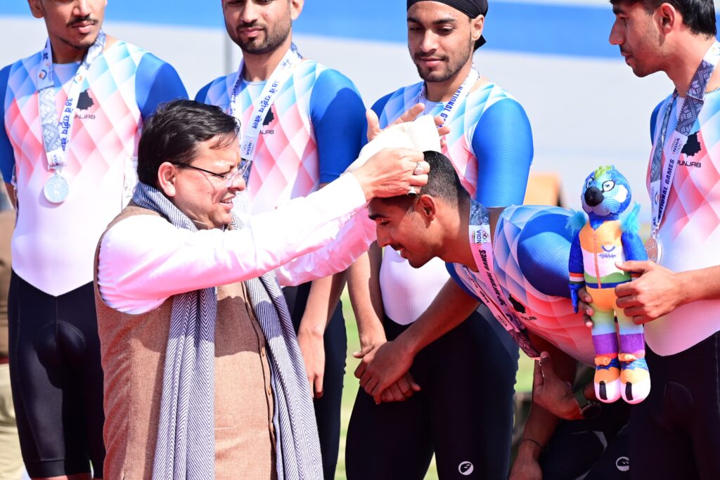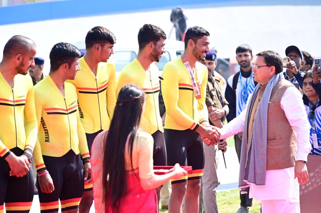 मुख्यमंत्री ने गुरुवार को मनोज सरकार स्पोर्टस स्टेडियम में 38वें राष्ट्रीय खेलों के अन्तर्गत शिवालिक वेलोड्रम मे ट्रैक साइकिलिंग प्रतियोगिता को दर्शक दीर्घा से देखा। उन्होंने वेलोड्रम पहुंचकर खिलाड़ियो से परिचय प्राप्त कर ट्रैक पर साइकिलिंग भी की। इसके बाद मुख्यमंत्री ने पुरूष वर्ग के टीम परस्यूट डिस्टेंस 4000 मीटर प्रतियोगिता में स्वर्ण पदक विजेता सर्विसेज स्पोर्टस कंट्रोल बोर्ड, रजत पदक विजेता पंजाब व कांस्य पदक विजेता राजस्थान को मैडल व पहाड़ी टोपी पहनाकर सम्मानित किया। इसके उपरान्त मुख्यमंत्री ने खिलाड़ियों के साथ भोजन किया व खिलाड़ियों के लिए की गई व्यवस्थाओं के बारे में खिलाड़ियों से जानकारी ली जिस पर खिलाड़ियो ने सभी प्रकार की व्यवस्थाओं पर प्रसन्नता व्यक्त की।