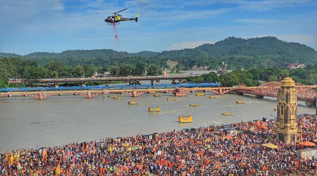 -हरिद्वार आये कांवडियों एवं शिव भक्तों पर हुई हैलीकॉफ्टर से पुष्प वर्षा.